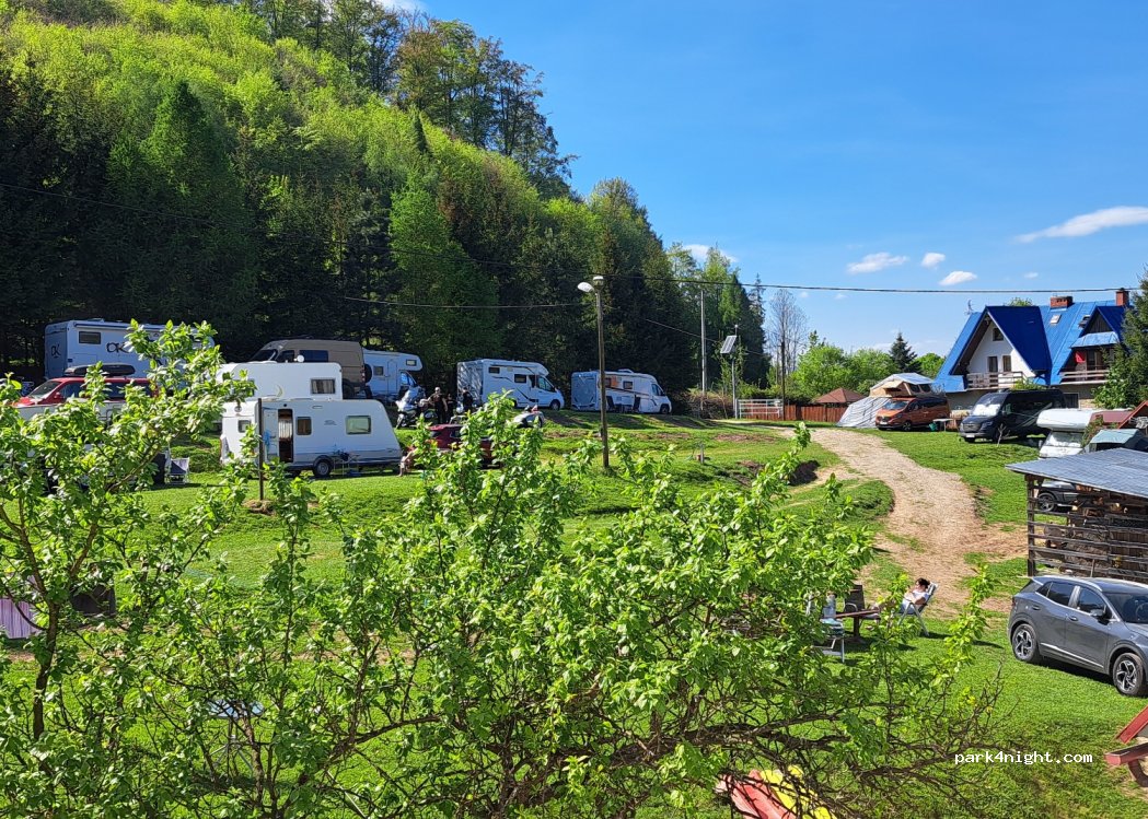 Fajny kameralny kemping na stoku z półkami do parkowania lub pod namioty. Sanitariaty czyste. Można zrzucić szarą wodę i zatankować świeżą. Miły gospodarz. Kamper 3 osoby z psem 100zł doba.