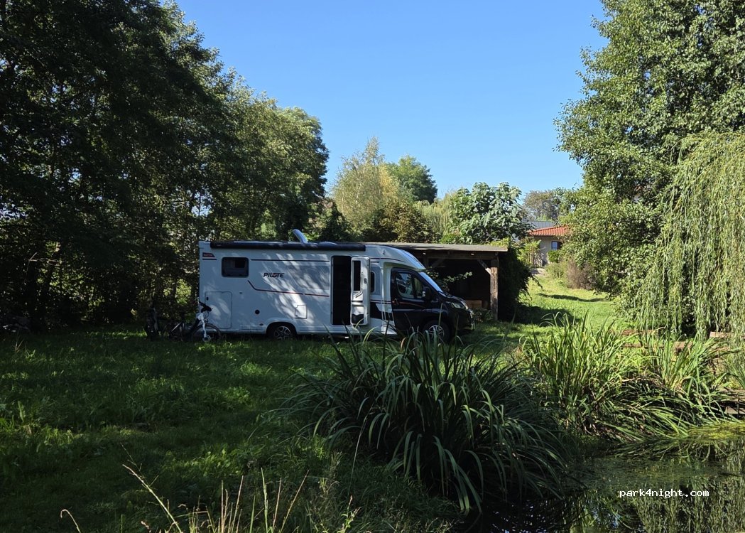 Schöner Platz an einem Bach und Teich(Mücken mäßig).Besitzer sehr nett,spricht bißchen englisch.Stehen ist kostenlos, aber kein Strom, keine Sanitäranlagen, nix.Wer Wein und Ziegenkäse mag, kann es im Weinkeller verkosten. Einfach hinstellen und wohlfühlen.