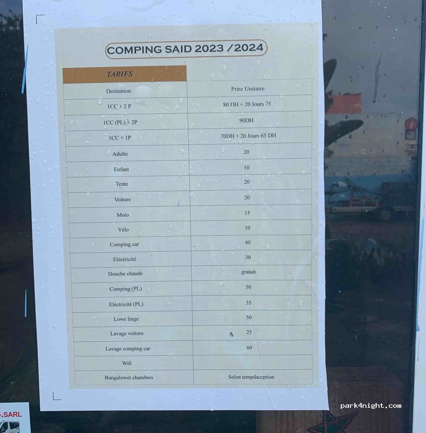 camping Saïd interna accueil sympa familial calme je vous le conseille prix raison prop nous somme très ravis nous étions accueillis par la patrone Saïda sur place , les sanitai sont prop. sécurisé 24H/24H avec des vidéos surveil jour et nuit plus les agents sécu prix de juillet et Août c est un forfait 150dhs/jours hors période été 105dhs/jours, charges comprises.Eau elec amicalement
