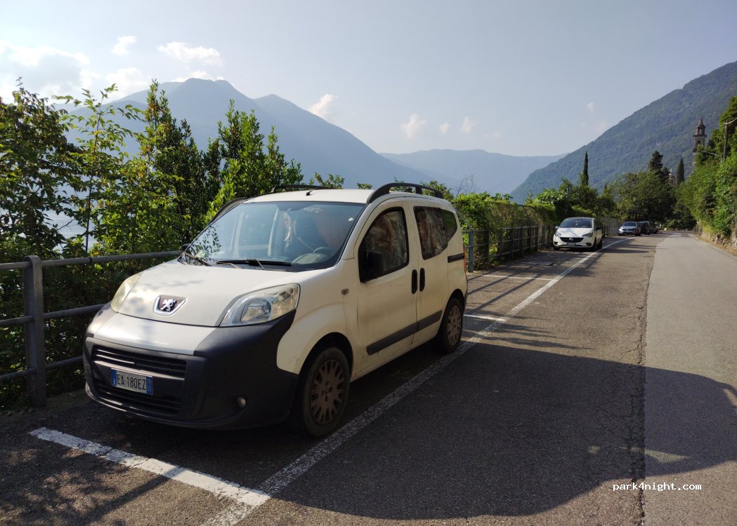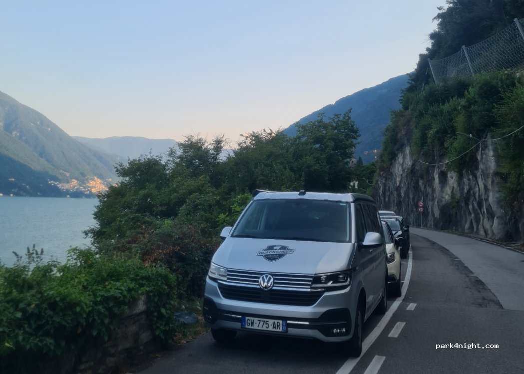 Street side parking with lake view, we stopped here one night before leaving again following the advice of a local, we parked in the last place at the bottom of the village road, very quiet apart from a few cars every now and then. recommended for a quick night stop. no services in general park only cars. we recommend a ride in the historic streets of brienno, some lead to the lake where you can go for a swim.