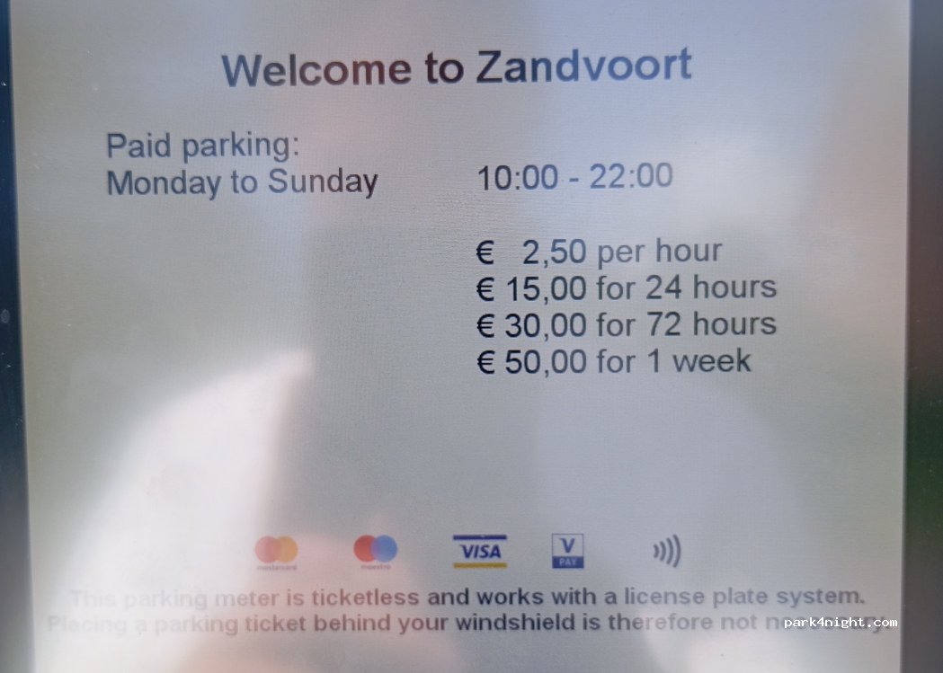 We can’t recommend to stay there over night. Simple parking spot on the road in a residential area. Max. 4-5m long. Camping in Zandvoort is strictly forbidden.