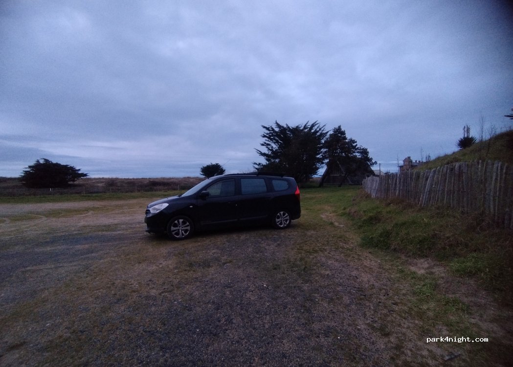 Tres grand parking en terre, barre a 2,1m, pas de vue sur la mer MAIS bruit des vagues la nuit, plage a 100m et surtout magnifique sentier cotier pour les amateurs de trail. on se croirait en Corse, 400m de denivele sur aller retour de 14 km. 2 nuits passees sans aucun probleme.