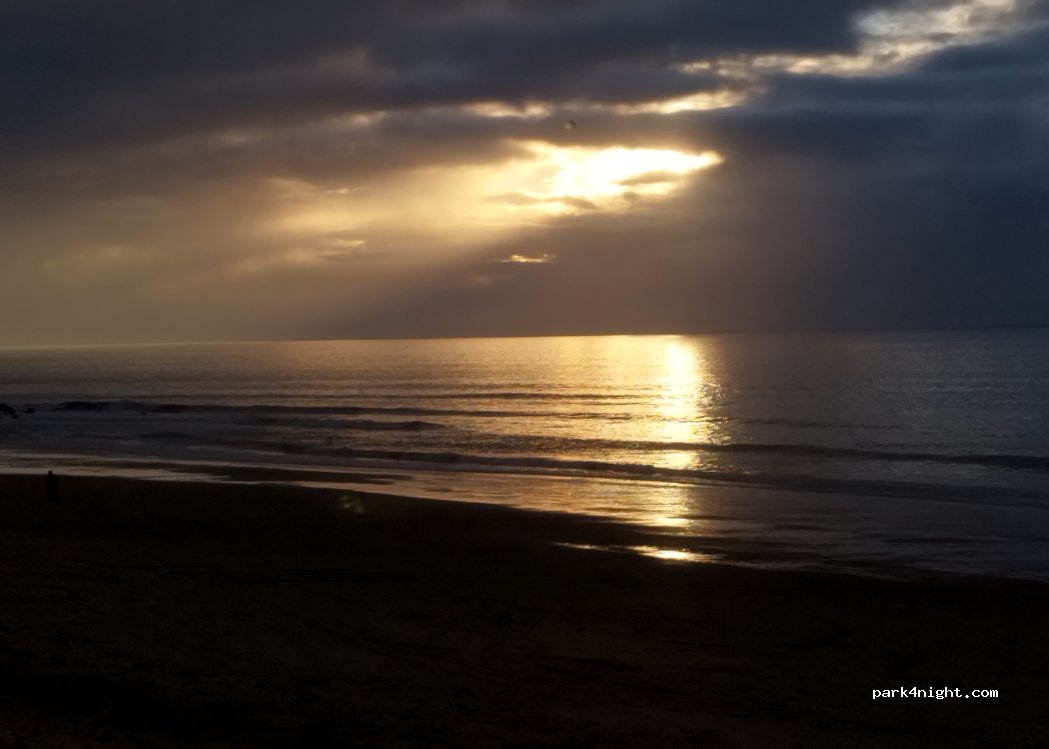 Großer Parkplatz, Lehm und Sand. Begrenzte Höhe, nur für Auto und Van nicht zu hoch. Wir haben eine Nacht ohne Sorgen über ein Wochenende Anfang Juni geschlafen. Der Parkplatz leert sich am Ende des Tages vom Strand (100 m entfernt). Nur ein paar Dutzend Lieferwagen sind noch übrig. Toiletten in Strandnähe. Wohnmobilfläche auf 150m. Herrlicher Küstenweg.