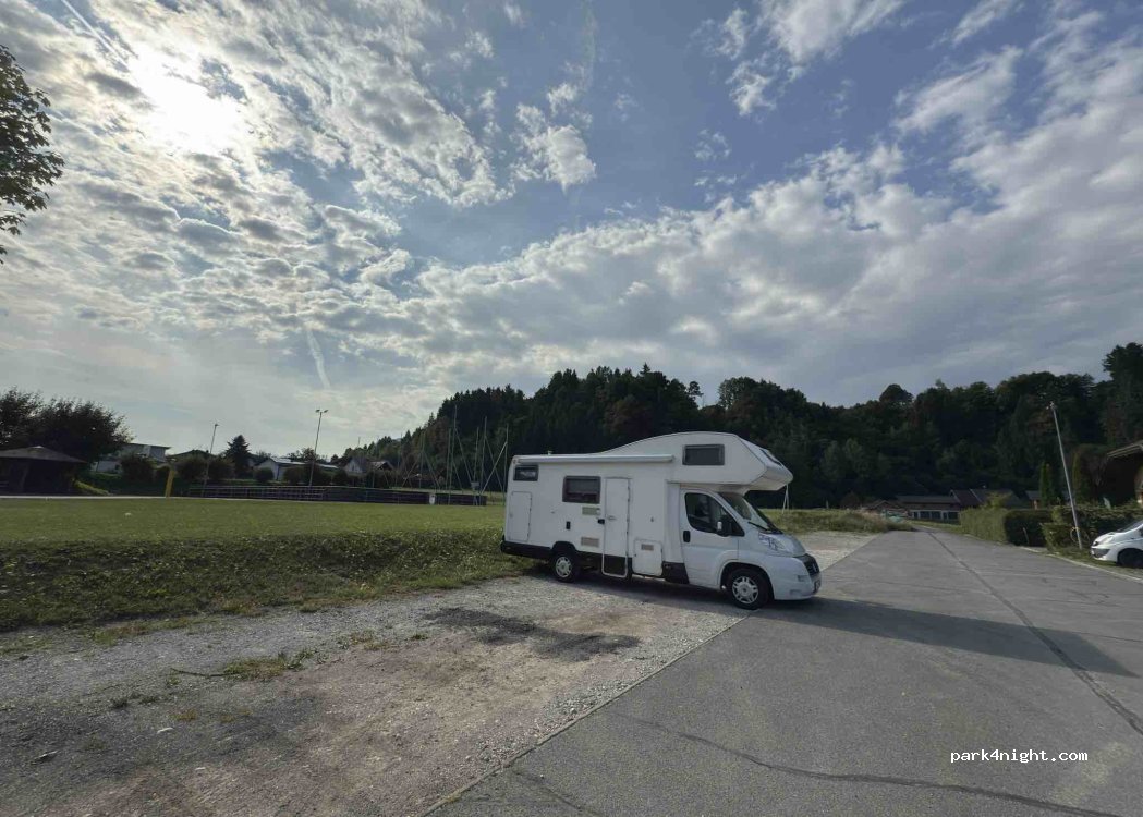 Wiederholungstäter ;). Eigentlicher Platz durch Zirkus genutzt, daher die Parkplätze rechts bei der Auffahrt benutzt. Diese sind nach oben hin abschüssig, aber ausgleichbar. Die Nacht wieder sagenhaft ruhig. Supermarkt mit Backwaren um die Ecke (Spar), aber obacht, kein Kaffee zum mitnehmen;). Waren zu dritt in dieser Nacht dort. Bitte weiter gewissenhaft benutzen. Danke an die Gemeinde dort.