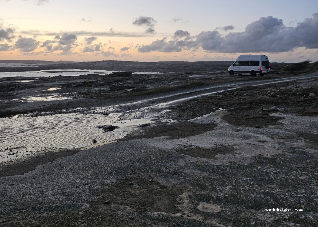 Ein wunderschöner Platz mit Blick auf das Meer, Sonnenuntergängen und einer Möglichkeit zum Baden. Haben den Tipp von Einheimischen bekommen. Am Rand der Schotterstraße gibt es genügend Plätze. Sogar große Mobile haben Platz (aber bitte vor Einfahrt Besichtigen). Super Blick auf Kungshamn. Die Straße wird von Einheimischen für Spaziergänge genutzt. Bitte verlasst den Platz wieder sauber. In der Zeit von 15.6-15.8 campen verboten, auf der gesamten Insel.
