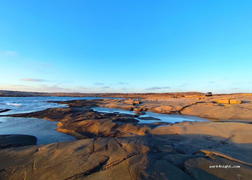 Landed on the moon with spectacular sunset and falling asleep to the crashing waves and howling wind . With a 4 x 4 , high clearance you come all the way down to the flat and smooth granite by the sea