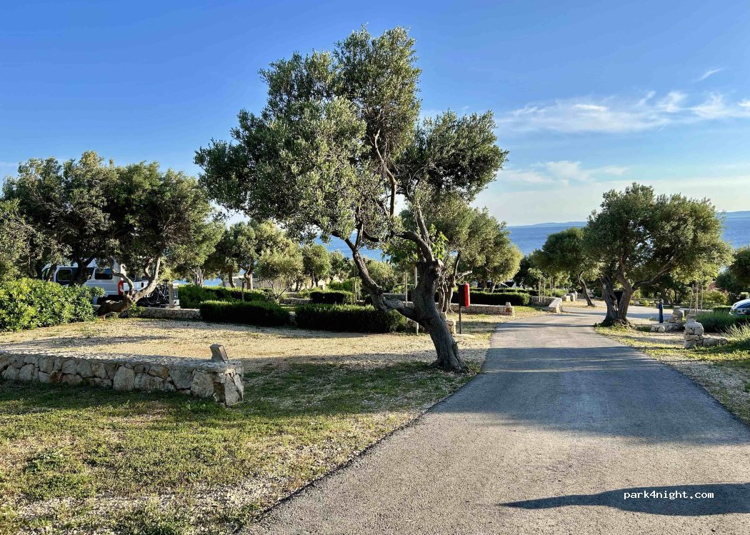 Spory, atrakcyjnie położony na zboczu wzgórza, nad brzegiem morza, kemping. Duże i fajne parcele wśród drzew oliwnych, żywopłoty z rozmarynu i lawendy, czasem drzewko figowe. Wiosną harcują ptaki i inne stworzenia; miejsce bardzo przyjazne czworonogom, a plaża dla psów bije inne na głowę. Przed sezonem spokój, cisza i niezłe ceny. O porządek na kempingu cały czas dba wielu pracowników.