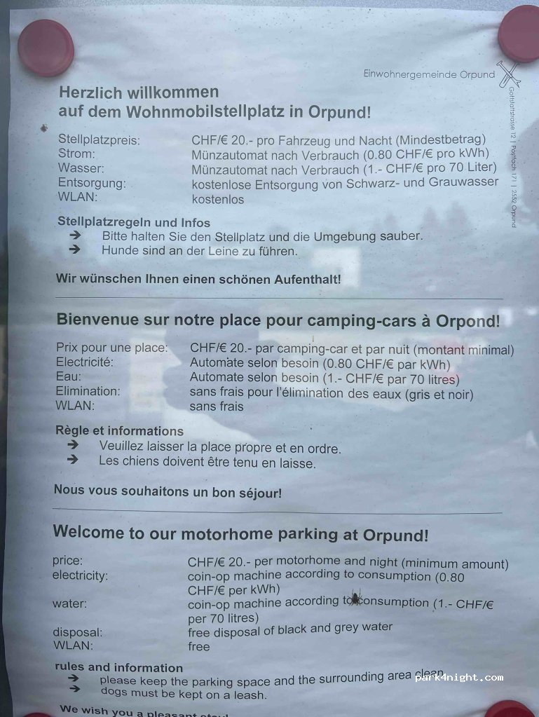 Schöner Stellplatz der Gemeinde Orpund. 20 CHF oder Euro, beim Bezahlen mit app 3 Euro mehr, dafür braucht es kein Bargeld. FreeWLAN in einer Top Qualität bereitgestellt. Nettes Beizli direkt nebenan. Sonntag bis 18 Uhr geöffnet, Montag Ruhetag, ansonsten täglich bei gutem Wetter. Sehr ruhig, super sauber und gepflegt. Für Strom braucht man Münzen. Danke Orpund, dass wir hier sein dürfen.