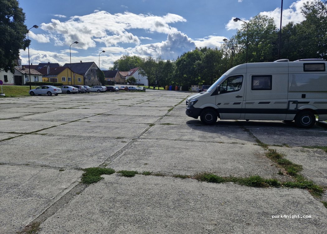 Velké parkoviště na rovině u rybníka. Dostatek místa. Ve dne i v noci naprostý klid. Vhodné i pro auto s přísem - karavanem. Doporučuji.