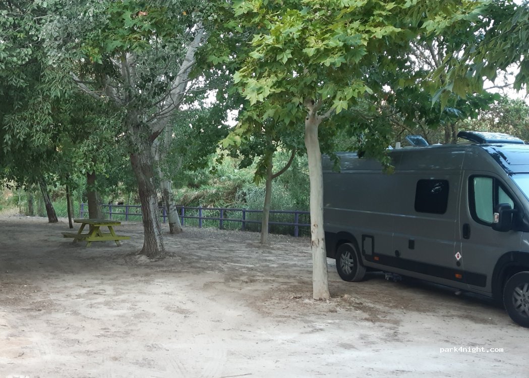 Shaded picnic and a small river at the entrance of the village. We did not spend the night but we were alone. Maybe the weekend will change the atmosphere. Dirt floor with trees, ideal for campers and small motorhomes. A cycle route passes ahead. The town 10 minutes walk.