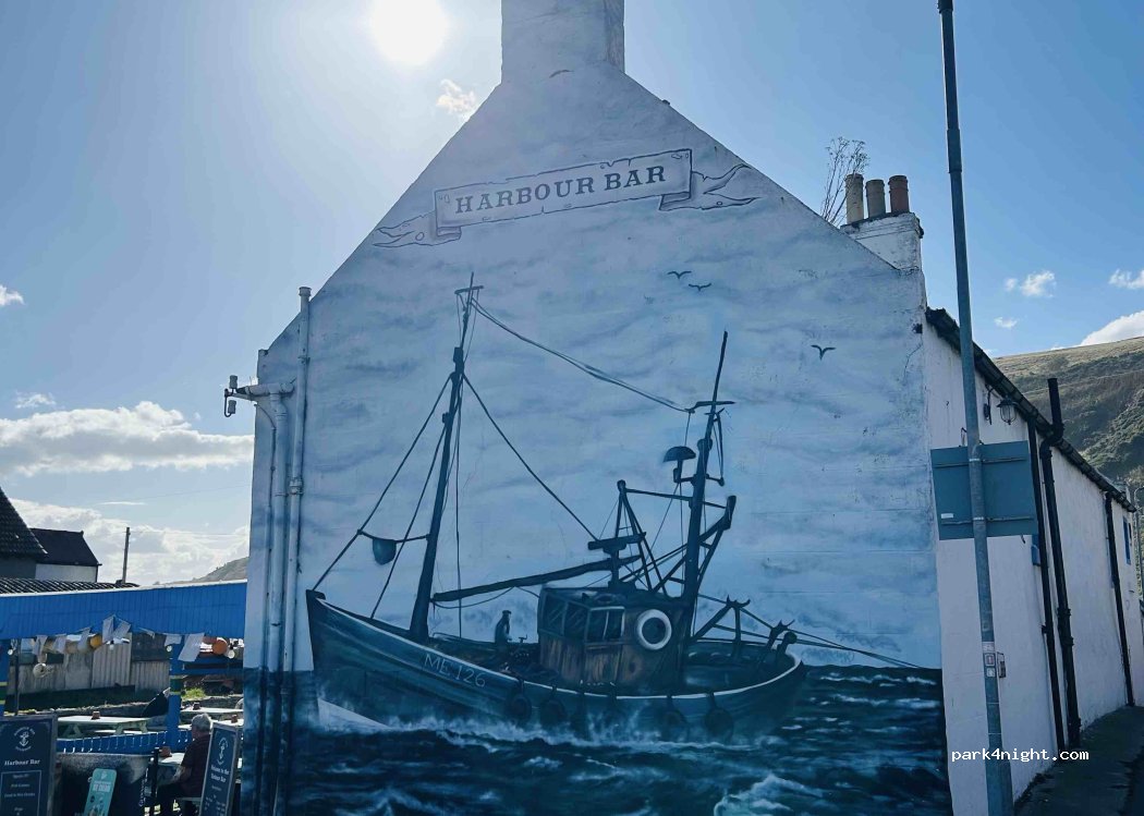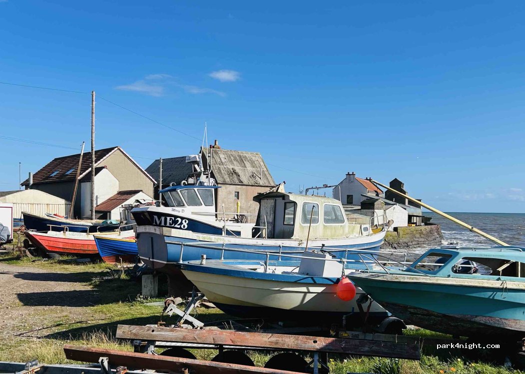 signs up saying no overnight parking on the harbour or pier . nice village one pub and fish and chips . streets narrow . houses all around . OK for a visit but not a stop over.