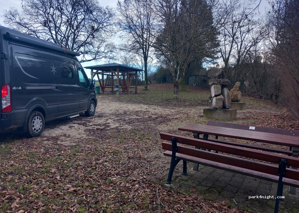 Wanderparkplatz mit schöner Aussicht. Kleiner Pavillion ist vorhanden. Bitte sauber halten. Schöner Ausgangspunkt für Wanderungen. Der Boden ist Schotter und zur Straße hin abschüssig.