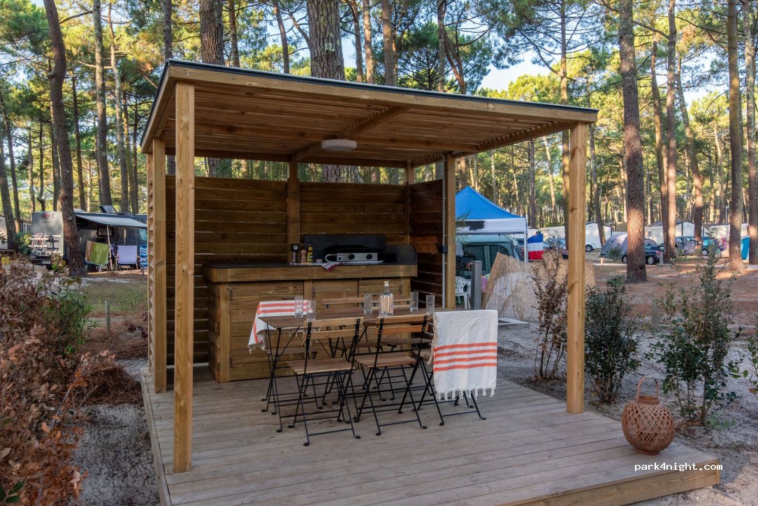 • Emplacement SIGNATURE avec terrasse équipée de 12 m² dont 9 m² couverts, réfrigérateur top, plancha à gaz, table, chaises et coffre-fort