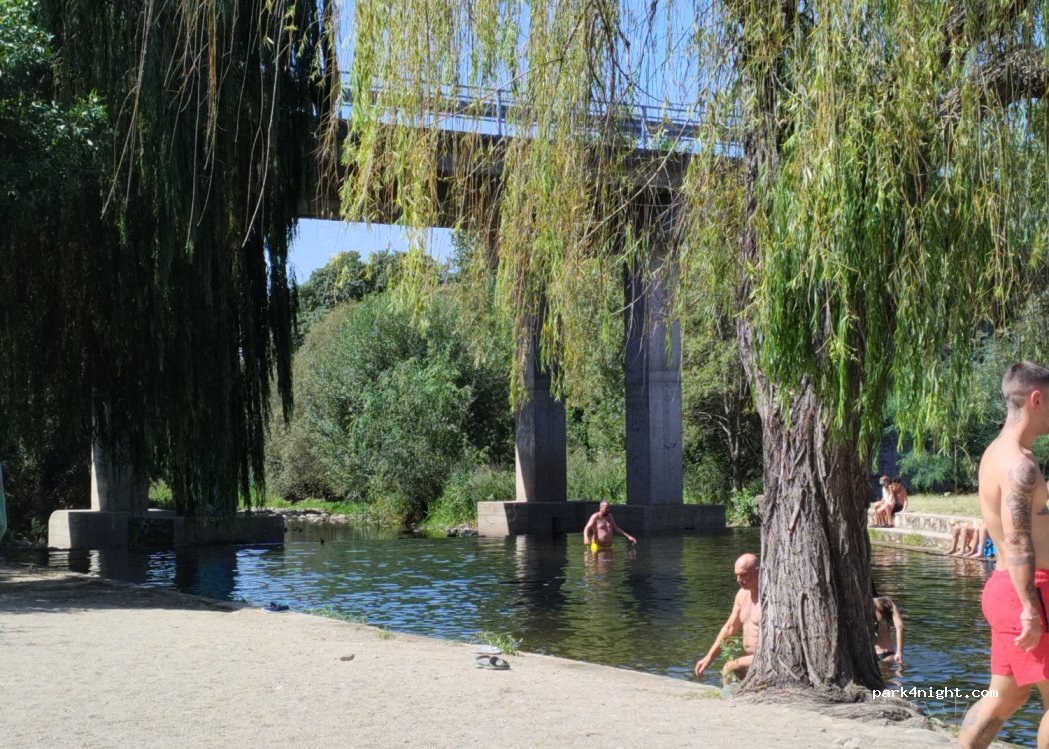 Lugar muy tranquilo, aunque tengo entendido que es un sitio que suelen hacer botellón. Recomiendo cruzar el puente de piedra y a la derecha quedarse bajo sombra de árboles. El aparcamiento se suele llenar de coches y es difícil encontrar sitio para un vehículo tan grande. Estuvimos una noche y no nos dijeron nada. La playa fluvial está muy bien.