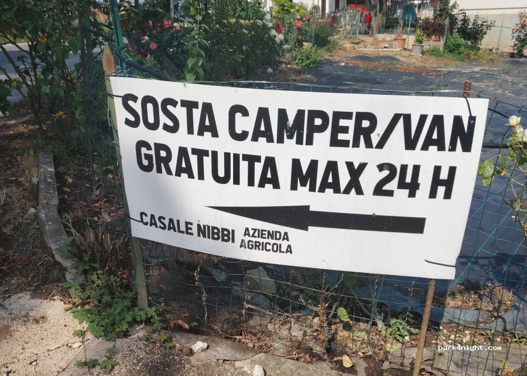 Aparcamiento gratuito 24h en Casale Nibbi (Azienda Agricola), el propietario Luciano es super atento. Posibilidad de comprar productos artesanos, miel, leche, queso, vino, aceite, yogurt… y visitar la granja. Hay zona de BBQ, Picnic y agua potable. Recomendable OK
