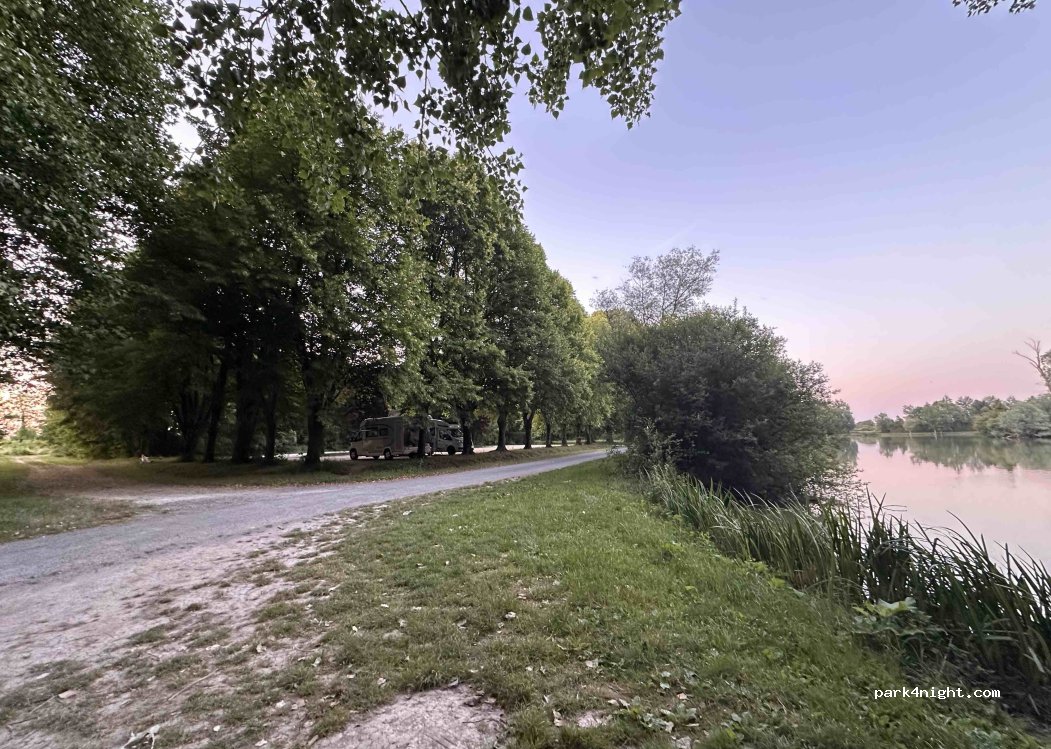 Flat shaded parking opposite small lake. Some road noise from motorway but ideal for overnight stop.