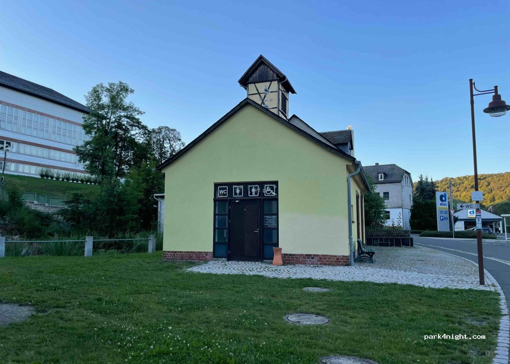 Sehr schöner ruhiger Platz. Unweit ist ein modernes öffentliches WC - 50 Cent. Morgens ist deutlich mehr Verkehr aufgrund des Ärztehauses gegenüber. Im Wanderstützpunkt gibt es eine warme Mahlzeit, der Supermarkt Diska ist 1 min entfernt. Zug Bhf empfand ich nicht als laut. Perfekt für den Rennsteigstart/ziel. Auch mehrere Tage parken kein Problem. Campingverhalten ist aber nicht angebracht, Müll bitte mitnehmen.