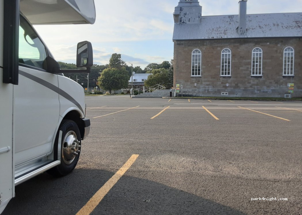 Très grand stationnement avec vue sur le fleuve et tout près de la marina. Étions environ 15 VR et il y avait encore plusieurs espaces. Très tranquille. Boîte pour les dons située à côté de la porte centrale de l’église. Dépanneur /saq situé à quelques minutes de marche.