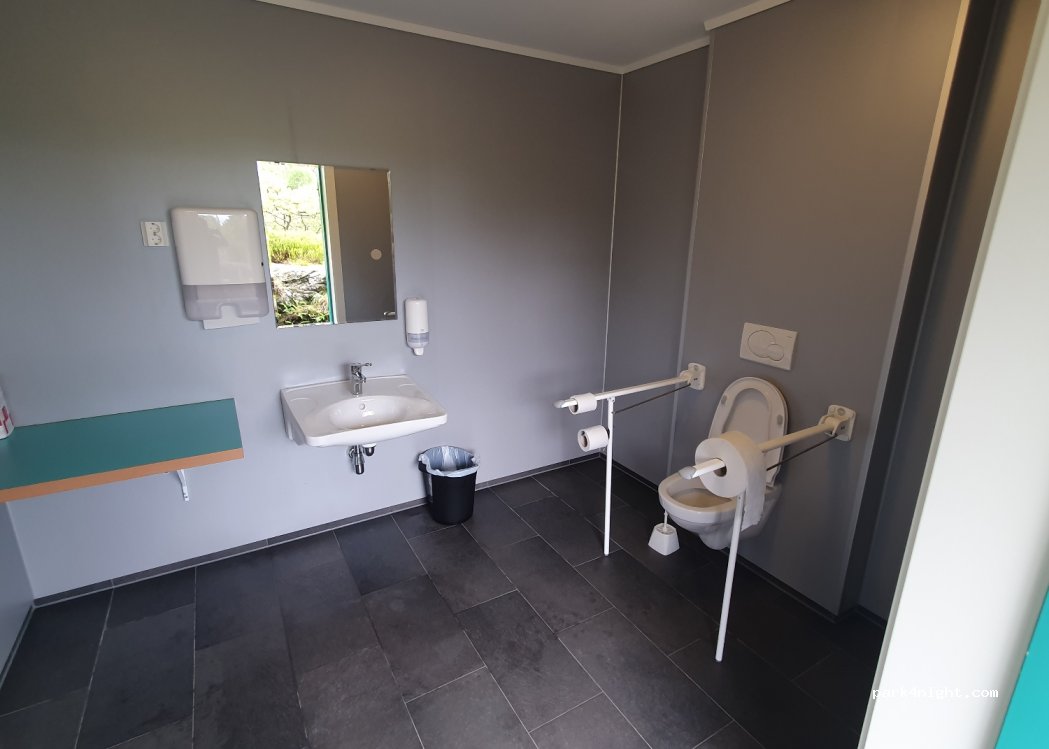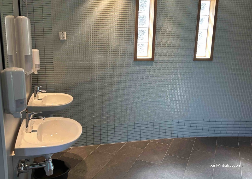 Sehr saubere Toiletten, danke dafür! Waschbecken mit warmen Wasser und ausreichend Seife wie auf Toilettenpapier vor Ort. Außen an den Toiletten jeweils 2x2 230V Schukosteckdosen. Nach 3 Tagen Dauerregen und quasi keinem Solarstrom konnten wir hier unsere Batterien binnen kurzer Zeit wieder aufladen ohne stundenlang durch die Gegend fahren zu müssen. Große Restmülltonne in unmittelbarer Nähe.