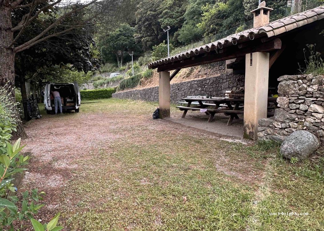 Picknickplatz mit Grill und Tischen. Das Land ist flach und schattig. Es gibt eine Kinderschaukel und eine Trockentoilette. Sehr ruhige Nacht in diesem kleinen Cevennen-Dorf. Kein Verbot.