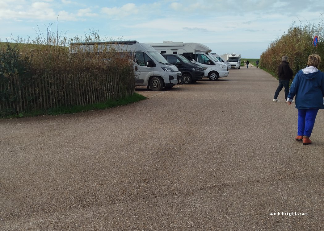 Places sans limitations de hauteur occupées par des voitures. Sinon, hauteur limitée à 2m10. Choisissez bien votre portique, nous sommes passés sans problème sous le premier et avons raccroché sous un 2e qui semblait effectivement affaissé... Sinon, très bonne localisation pour admirer le Cap blanc-nez. Impossible d'y passer la nuit et pas de services.