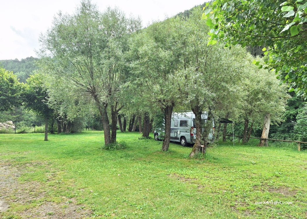 22€ AC i 2 adults, 5€ electricitat. Càmping molt enfocat a caravanes instal·lades permanentment, però amb alguna parcel·la lliure per viatgers. El riu passa just al costat, però la carretera N-260 també (la nit no passen molts cotxes). Llocs per banyar-se al riu. Ambient agradable.
