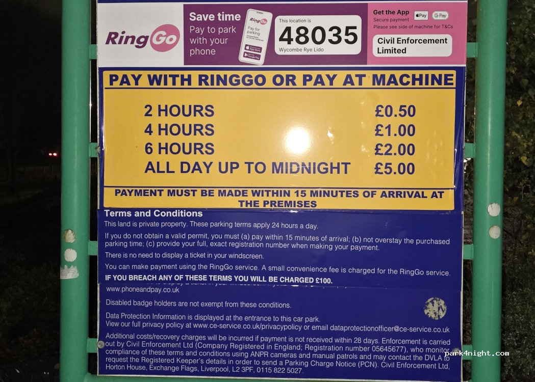 The posted parking terms have been updated to £5 until midnight (see photos) you must pay within 15 mins of arrival app can now be used as payment (10% surcharge) Parking is on a bit of a slope, bins nearby, leisure centre with amenities if required. Yes, you must buy a new ticket at 00:01 am So effectively £11 per day, if you stay in bed and use ringgo app to pay at midnight