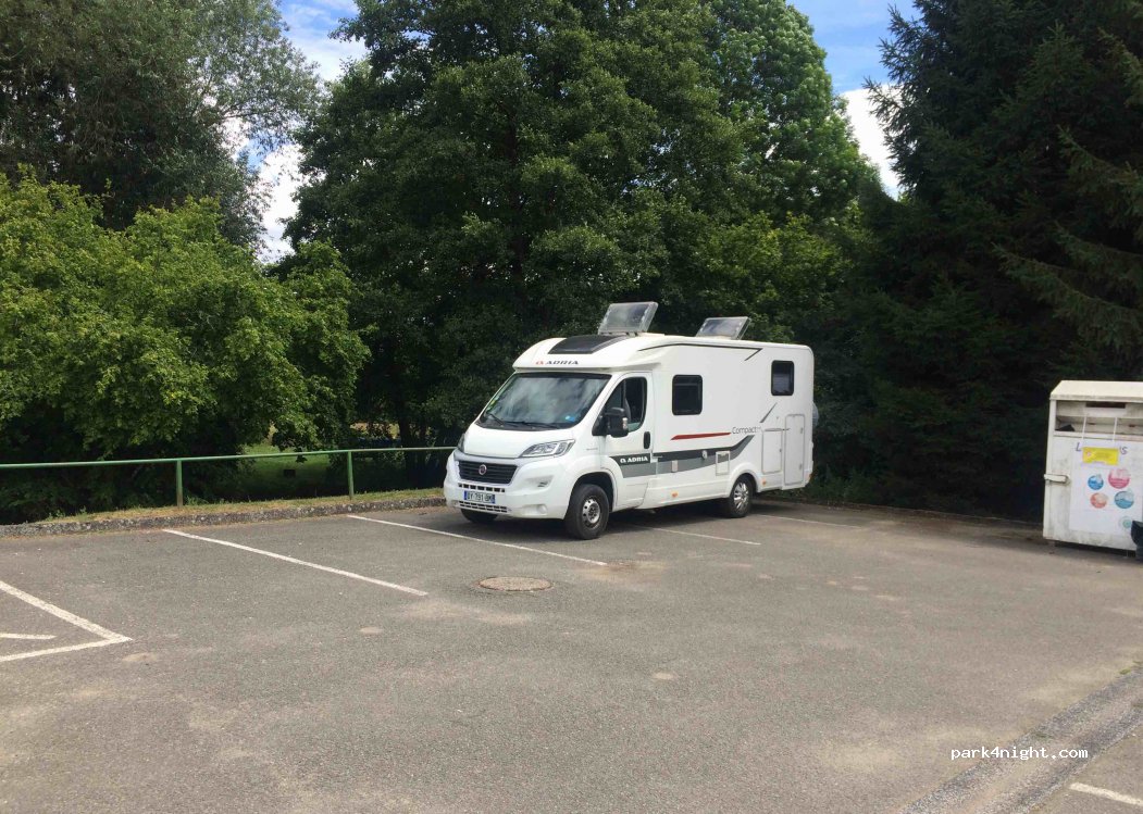 Parking au bord d’une rivière. Bien pour casser la croûte. Calme. On n’a pas testé pour la nuit.Benne à verres sur place !