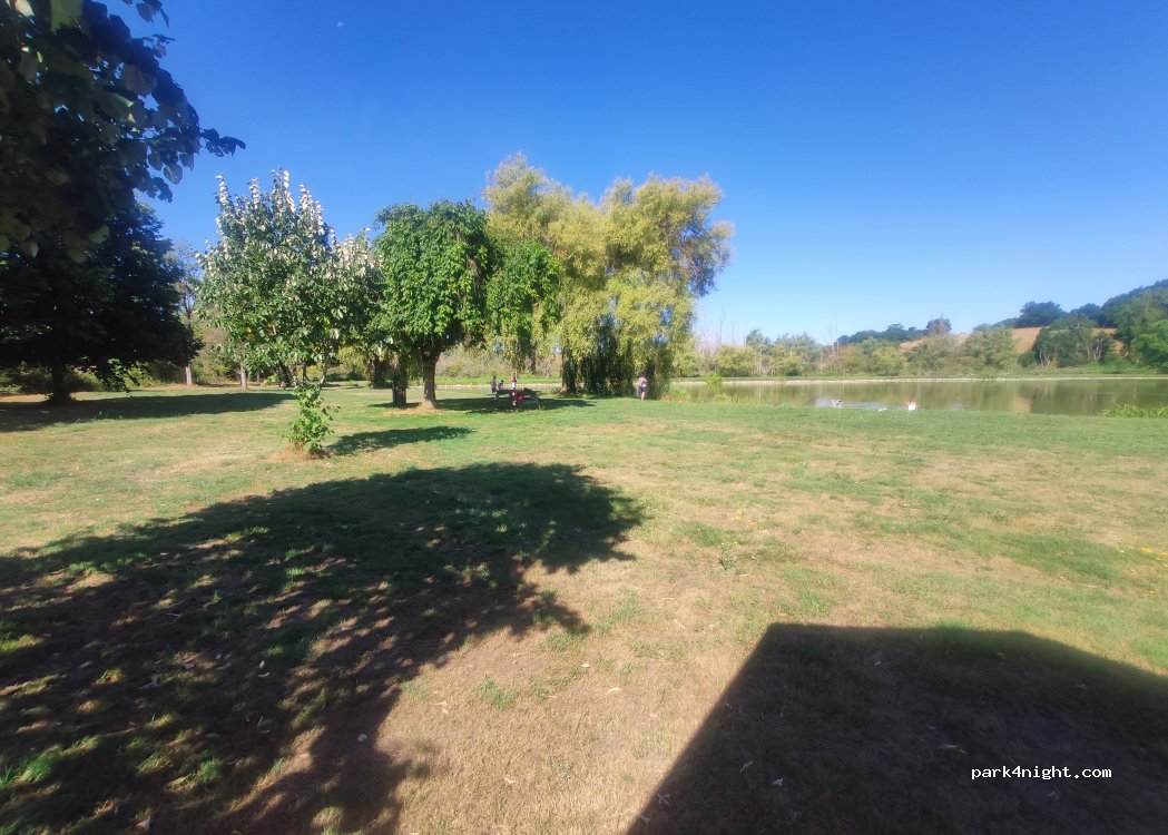 Au bord de l'étang, très calme. Eau et sanitaires à côté du parking.