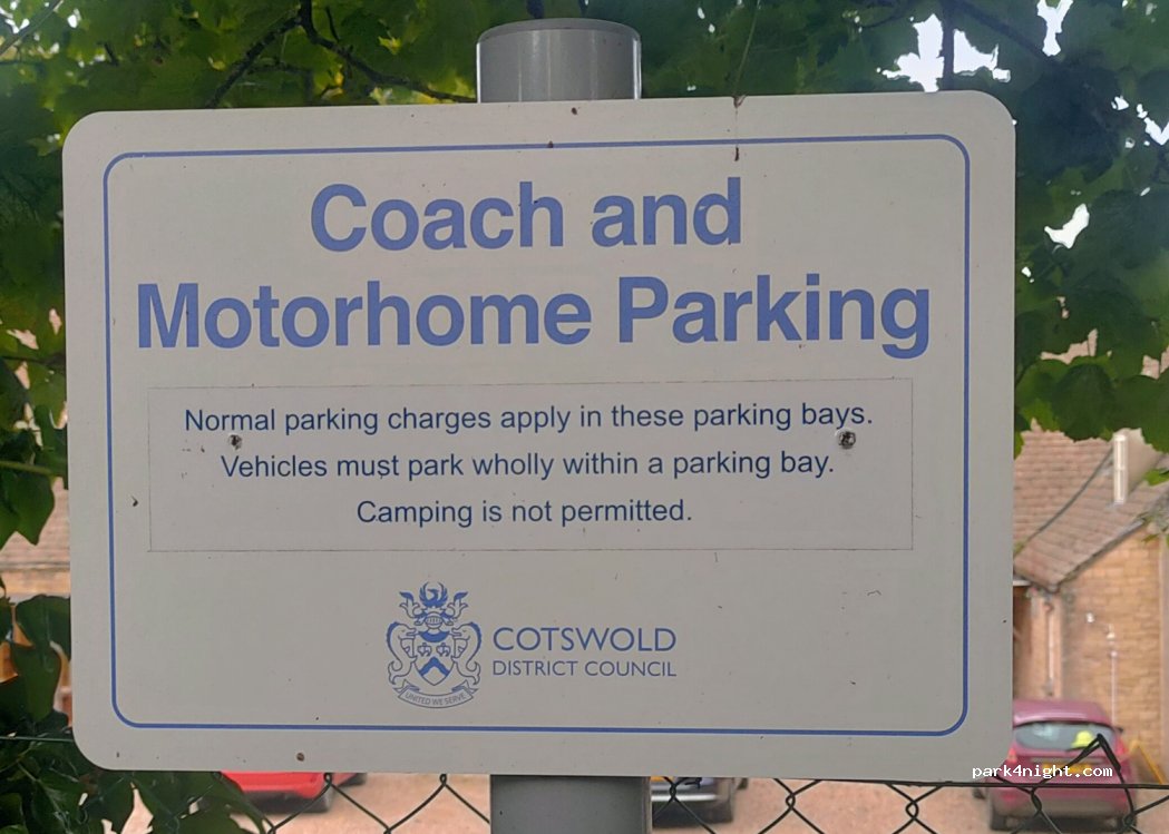 Quiet car park, lots of spaces with a short walk to pubs, bakery and town centre. A little bit of an incline, but had a fairly comfortable night. Good recycling facilities. Stow-on-the-wold is a small quaint town, and a nice place to grab lunch/kill a few hours.