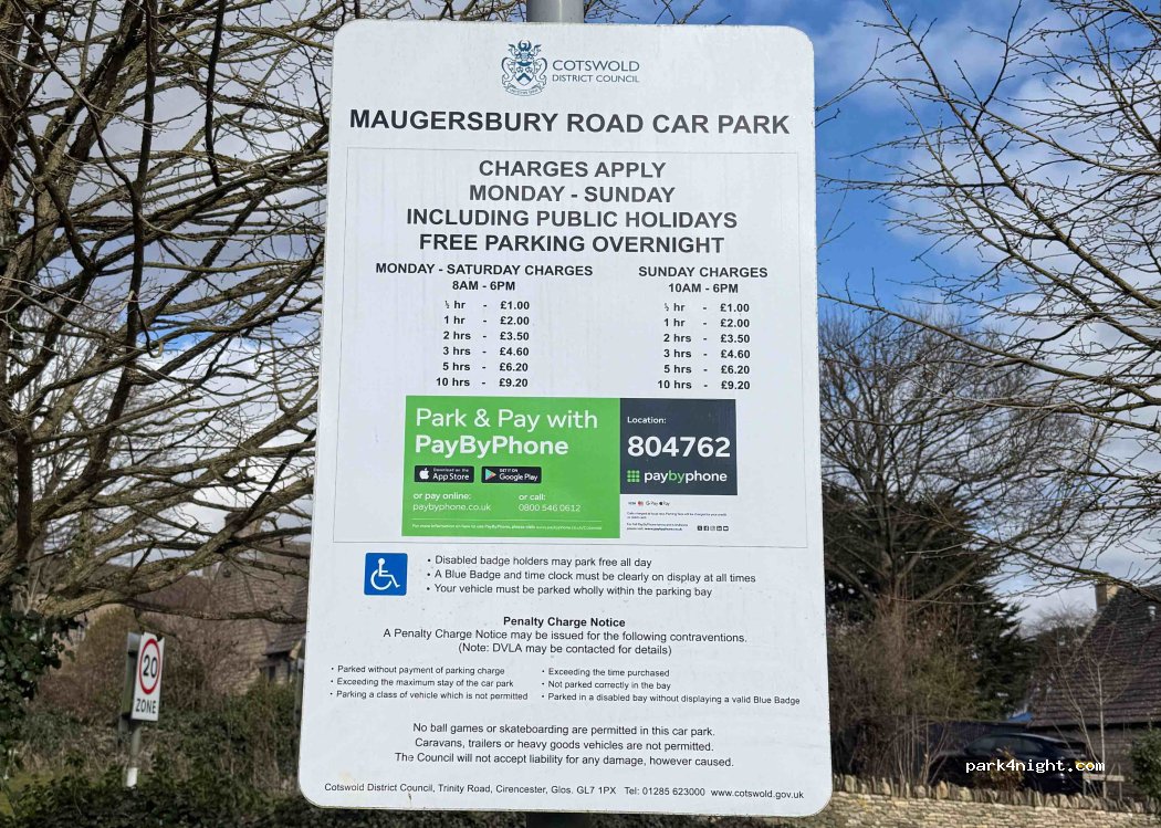 Parking routier de Maugersbury Stow-on-the-wold. Parking de nuit gratuit de 18h à 8h, très calme et proche du centre de Stow. La cloche à proximité du parking. Toilettes publiques ouvertes de 8h à 20h. Le parking est en pente.