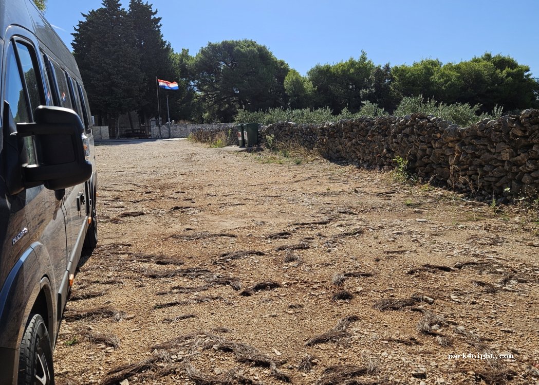Nous y avons séjourné 1 nuit arrivé vers 22h30, Nuit tranquille la place était vide donc seul, idéalement situé et gratuit pour se mettre en transit et à l'écart des zones touristiques et coûteuses de la côte. A 40 min du parc naturel et des cascades de KrKA