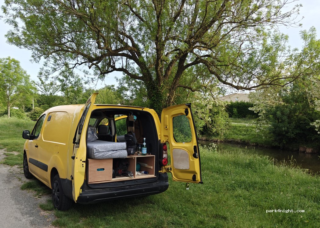 Très joli spot au calme pour passer la nuit. Nous étions seuls. Le bruit des poissons et des grenouilles dans le canal nous a accompagné :) quelques voitures ou promeneurs sont passés en soirée et en matinée mais vraiment pas gênant, c’est une route peu fréquentée
