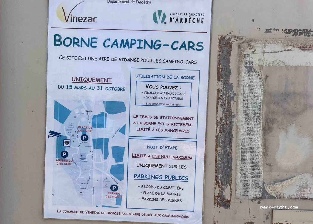 Merci à la commune de Vinezac pour les services gratuits. Ce jour (19/08), tout est en fonctionnement. Aire de stationnement calme et agréable.