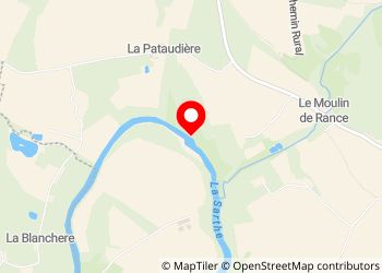Sentier avec bifurcation menant à la plage de la Sarthe. Accès canoë donc calme de 20h à 9h uniquement. Place verte près d'un ancien moulin en ruine. Peu adapté aux camping-cars (idéal petit van)
