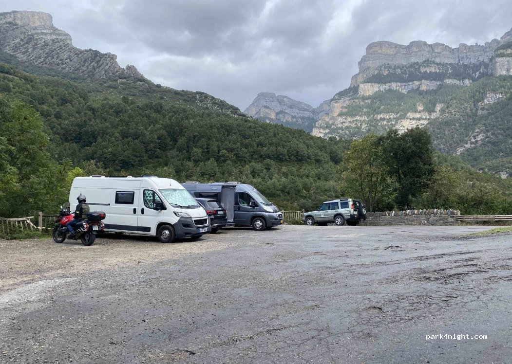 Es un aparcamiento muy pequeño, pero es ideal para hacer noche y hacer al día siguiente el cañón de Añisclo o las rutas de la zona. Es un lugar muy tranquilo, ya que esa carretera al caer la noche no tiene nada de tráfico.