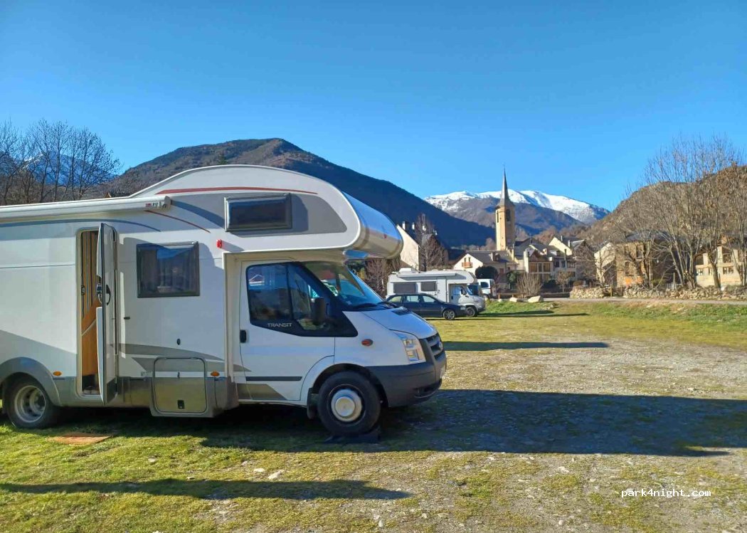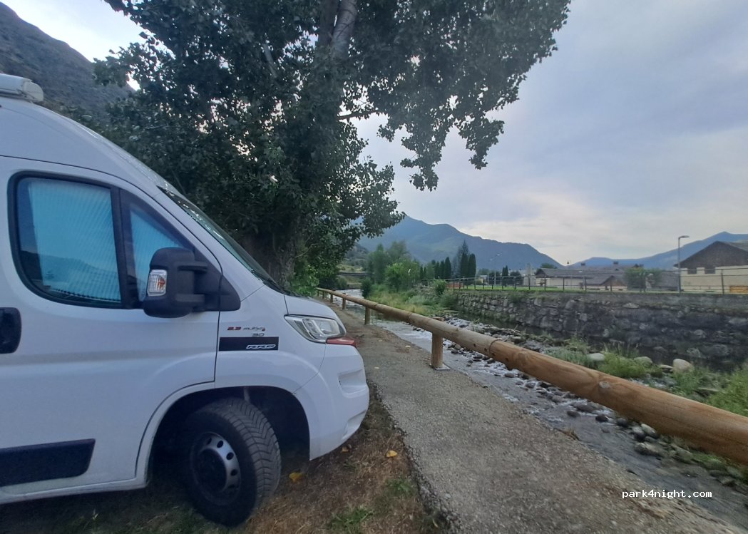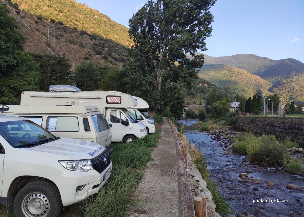 Parking tranquilo al lado del Río y bien para visitar el pueblo, es muy bonito y con más ambiente que Espot. La piscina municipal también bien.
