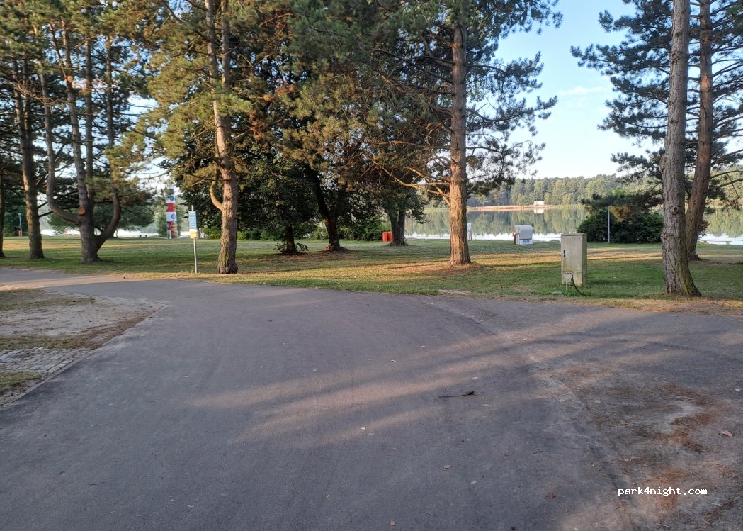 level open pitches, lots of clean toilets and showers, very large site, nice walk round the lake. Lake good for swimming. Noisy school party playing volleyball and then a bbq near to our pitch, but didn’t bother us. Very comfortable and relaxed site. young girl in reception spoke very good English.