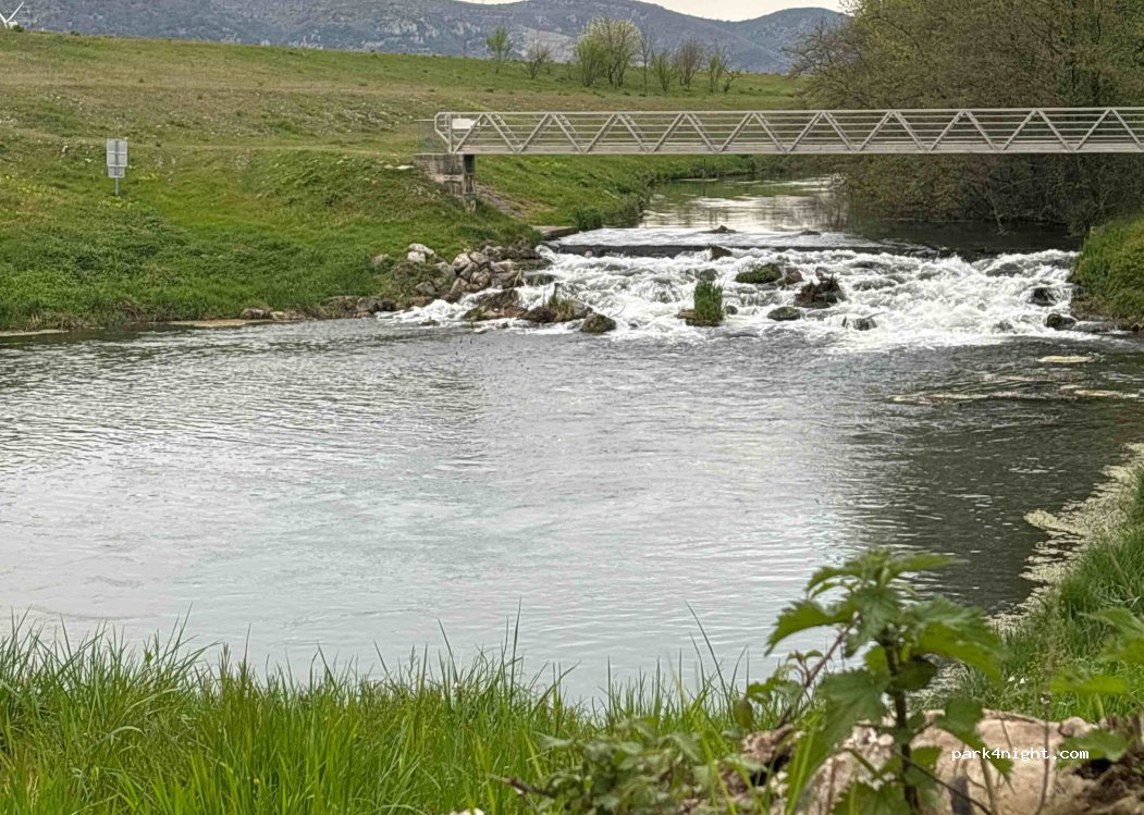 Grand emplacement sur de l’herbe. Bruit de l’eau en fond mais pas dérangeant et petite route de campagne au loin mais on n’entend pas les voitures passer. Des arbres qui cachent du vent, le soleil couchant et levant.