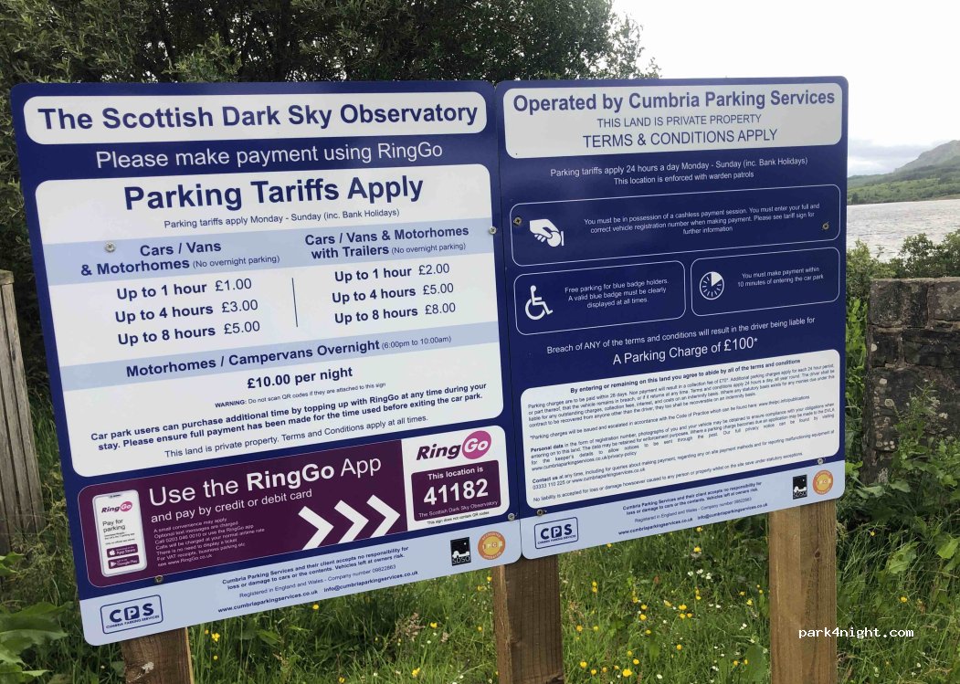 Der Parkplatz gehört jetzt dem Scottish Dark Sky Observatory, das ein neues Observatorium baut. Die Eröffnung ist für Ende 2026 geplant. Wasser und andere Einrichtungen sind noch nicht vorhanden. Abwasserentsorgung am Ende des Parkplatzes. Bezahlen Sie über die RingGo-App.
