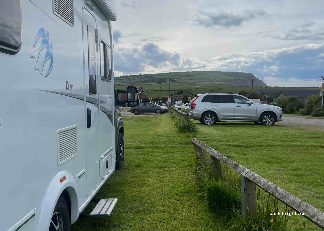 Go to the Private car park after council car park (next to each other). Payment to be made online £15 for 24 hours. Overflow area has sea view but top of normal car park is where we stayed. Quiet, peaceful and nice to be on grass rather than tarmac. Half a mile walk to the Co Op. Dark and away from roads or people. In September when we stayed it could be a private campsite. 2 vans in overflow