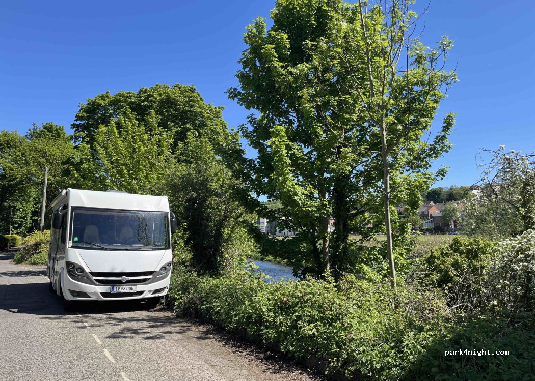 Great place to stop inthis beautiful city. Roadside parking pay 40p per half hour through day 8-6pm free over night. Few cars and joggers during the day lovely and quiet at night great nights sleep felt safe. City Center only few hundred yards away via the footbridge over the river Wear.