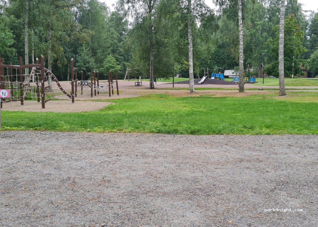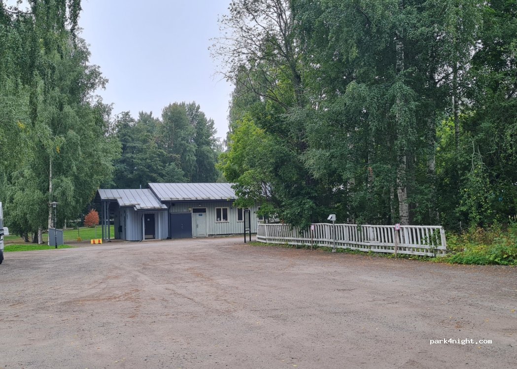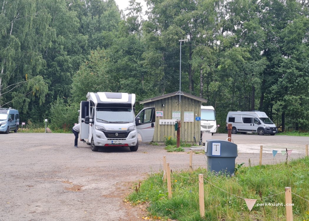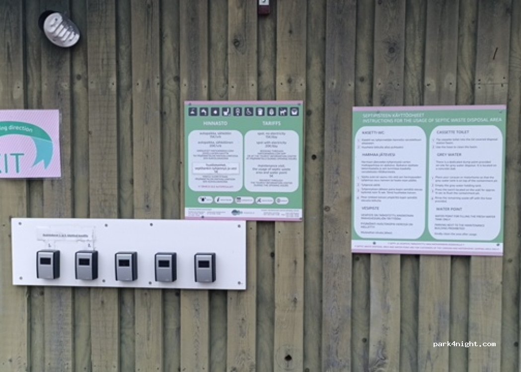 Bon endroit pour passer la nuit, mais les tarifs ne sont pas très clairs. Sur l’affiche, en anglais c’est gratuit sans électricité et 15€ avec, en finnois c’est 10€ sans et 15€ avec électricité… WC, douche et joli parc de jeux pour les enfants.