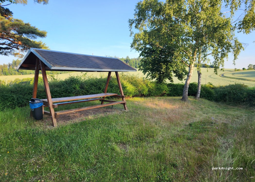 Picknickplatz mit Stellmöglichkeit für 2 Autos am Ortsausgang neben einer wenig befahrenen Straße. Toller Blick Richtung Talsperre. Saubere und gepflegte Picknickbank vorhanden.