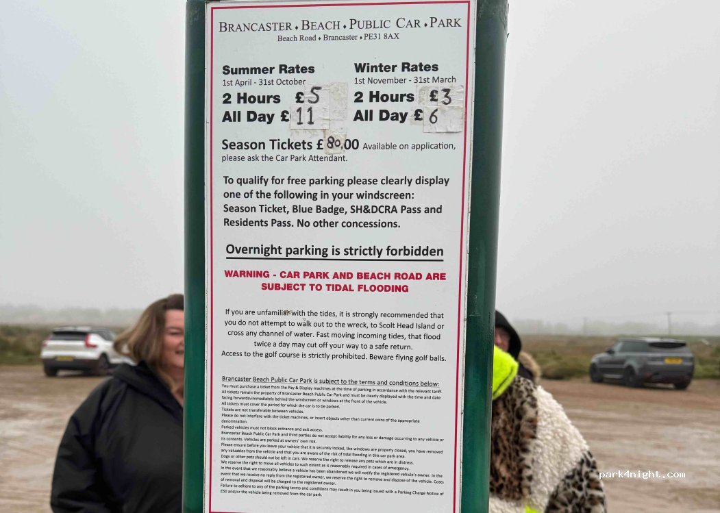 Visiting on a day trip, fantastic beach, dogs allowed. Parking is £8 till midnight thru summer, £4 in winter. On arrival had to wait at top of road for 30mins, security had road blocked off due to still flooded from high tide (they are really polite). Car park is large can easily hold couple of hundred cars. Probably gets very busy during school hols.