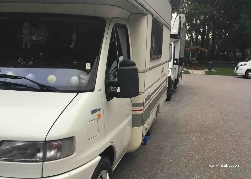 Wonderful little place. Public rest area with toilet (very clean), disposal for the toilet tank, less than 5 minutes from the motorway and yet very idyllic on a small lake. Toll-free! we could not find any evidence of an overnight stay ban ...