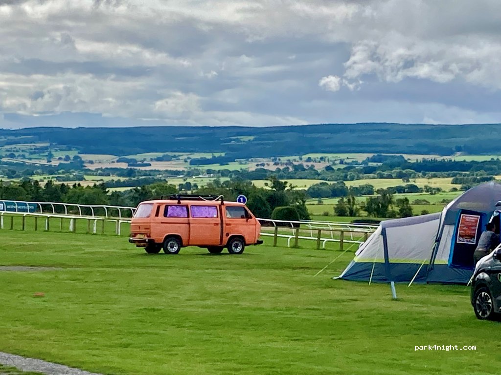An amazing place to stay, views are wonderful, peaceful too. £20 per night inc hook up. showers ,toilets and laundry. DON'T get put off driving though streets of houses as nothing but views of countryside only when get there. follow signs for Hexham race course .Not within walking distance of Hexham if mobility issues. Good parking at local park in town, suitable for campervan