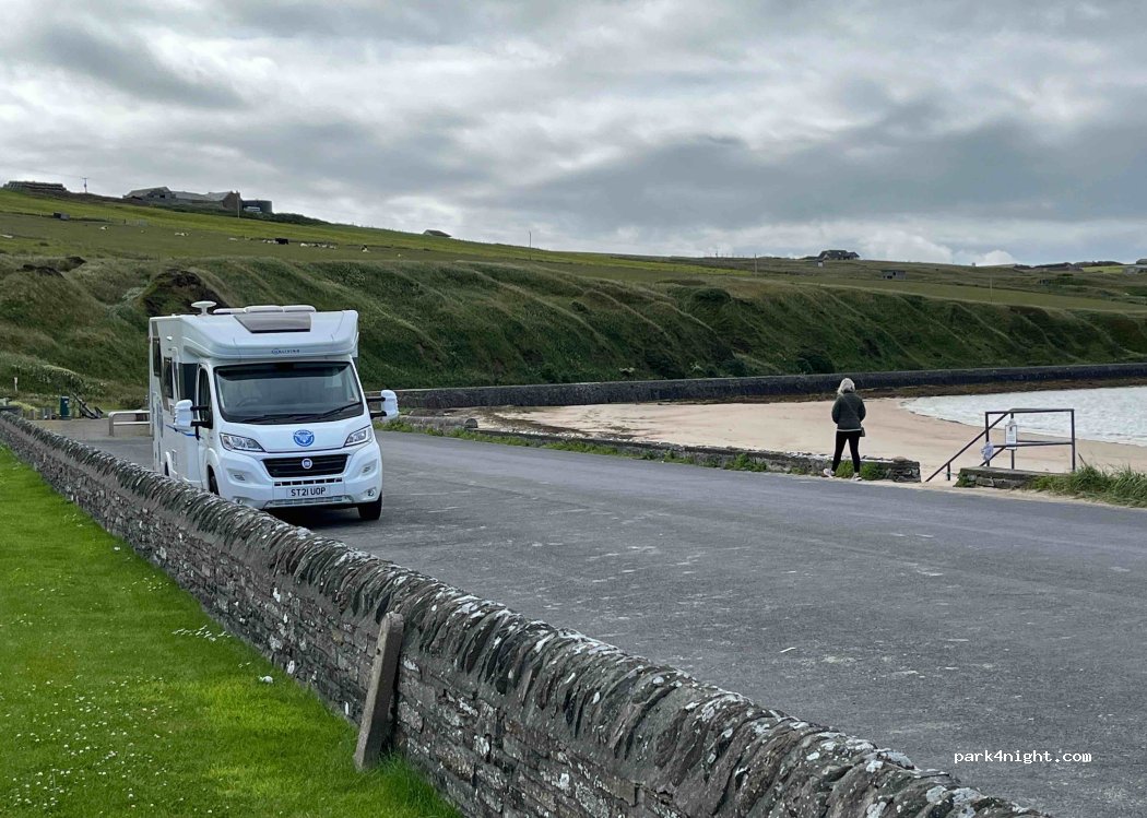Scapa Beach dispose d'un parking public avec toilettes et poubelles. Belle plage avec des couchers de soleil incroyables et du sable propre. Peut garer jour et nuit sans panneaux donc libre de garer environ 10 véhicules. Populaire auprès de la population locale et des promeneurs de chiens, il est animé pendant la journée et calme la nuit, c'est un port en activité au bout de la jetée avec des bateaux qui vont et viennent. Un jardin commémoratif au navire Royal Oak vaut le détour car il s'agit du site dédié aux hommes de la marine décédés pendant la Seconde Guerre mondiale alors que le navire défendait les Orcades.