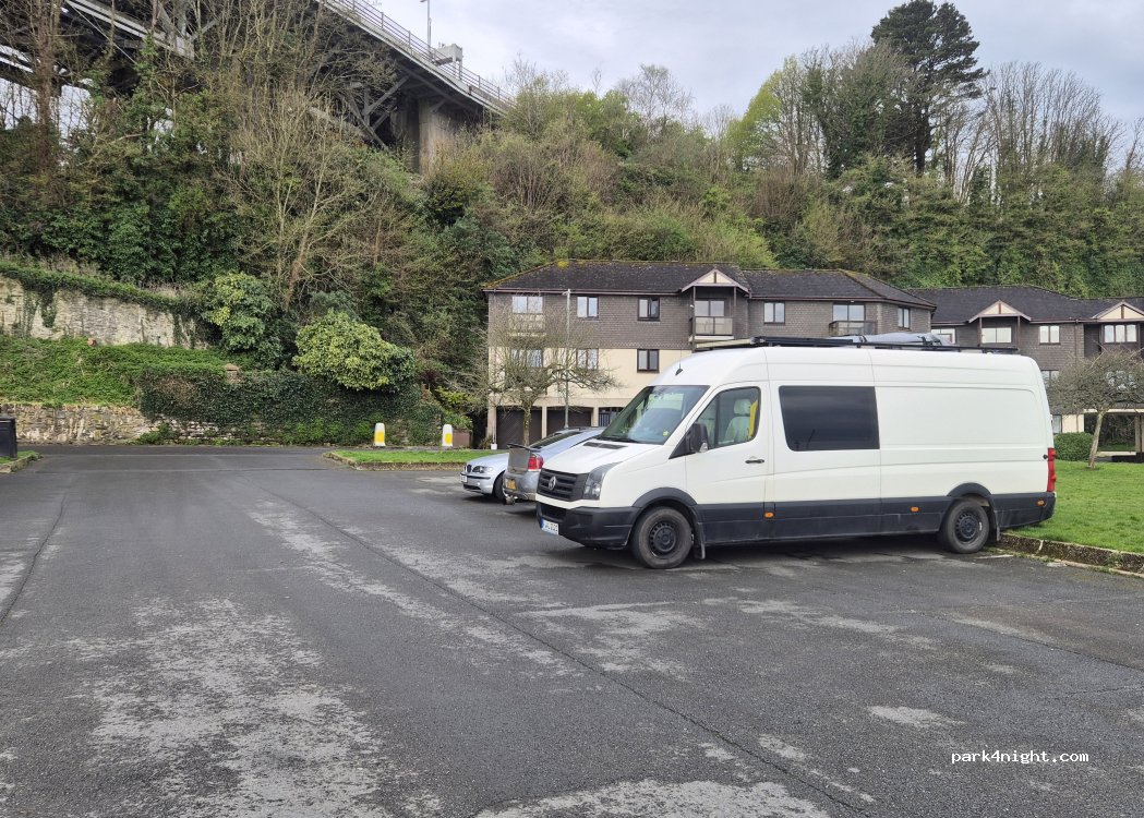 Großer Parkplatz, asphaltiert, maximal 60 Stunden parken, für Wohnmobile bis maximal 7 Meter, kein Campen, kein Übernachten (obwohl die Anwohner ausdrücklich gesagt haben, dass dies kein Problem sei). Anfahrt bitte nicht über die Lower Fore Street (eng, steil, 90 Grad Kurve). Toller Blick auf die Brücken und den Fluss.