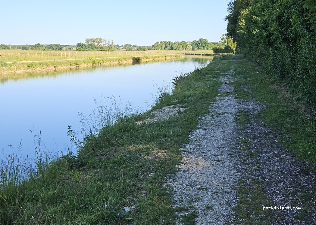 coin très tranquille, au bord du canal. il y a des arbres pour avoir plus d’intimité. Nuit très calme. Réveil tôt car il y a une ferme derrière et c’était un jour de moisson.
